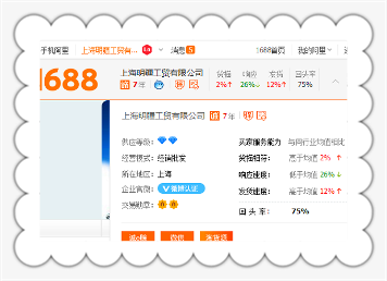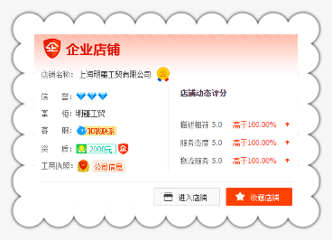 上海明疆工貿有限公司于2014年5月15日通過 阿里巴巴 企業誠信通認證.阿里巴巴網店:http://shop1394113357310.1688.com,網店開通買家保障服務,15天有任何質量問題包換\包退.公司于2015年6月10日通過阿里巴巴實地企業認證。